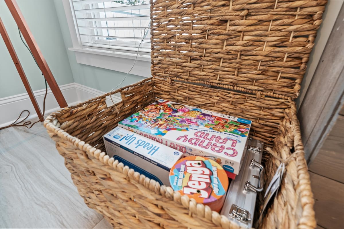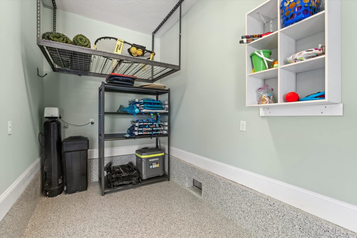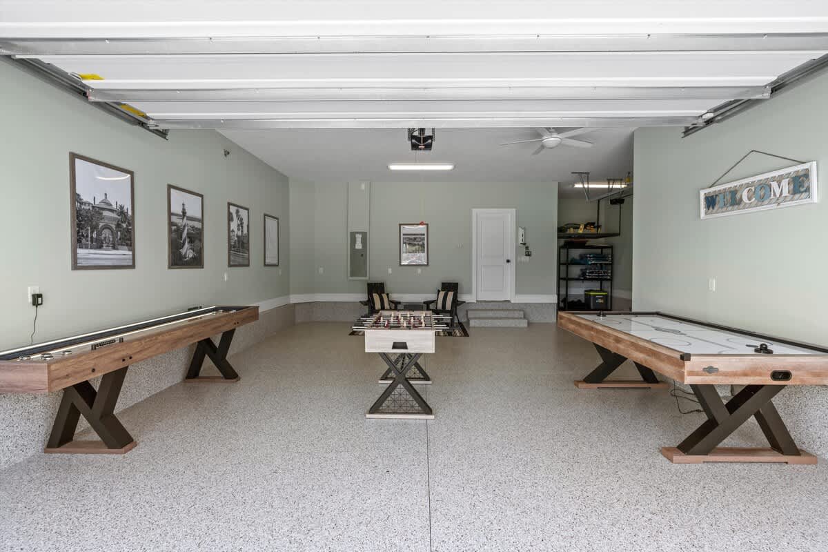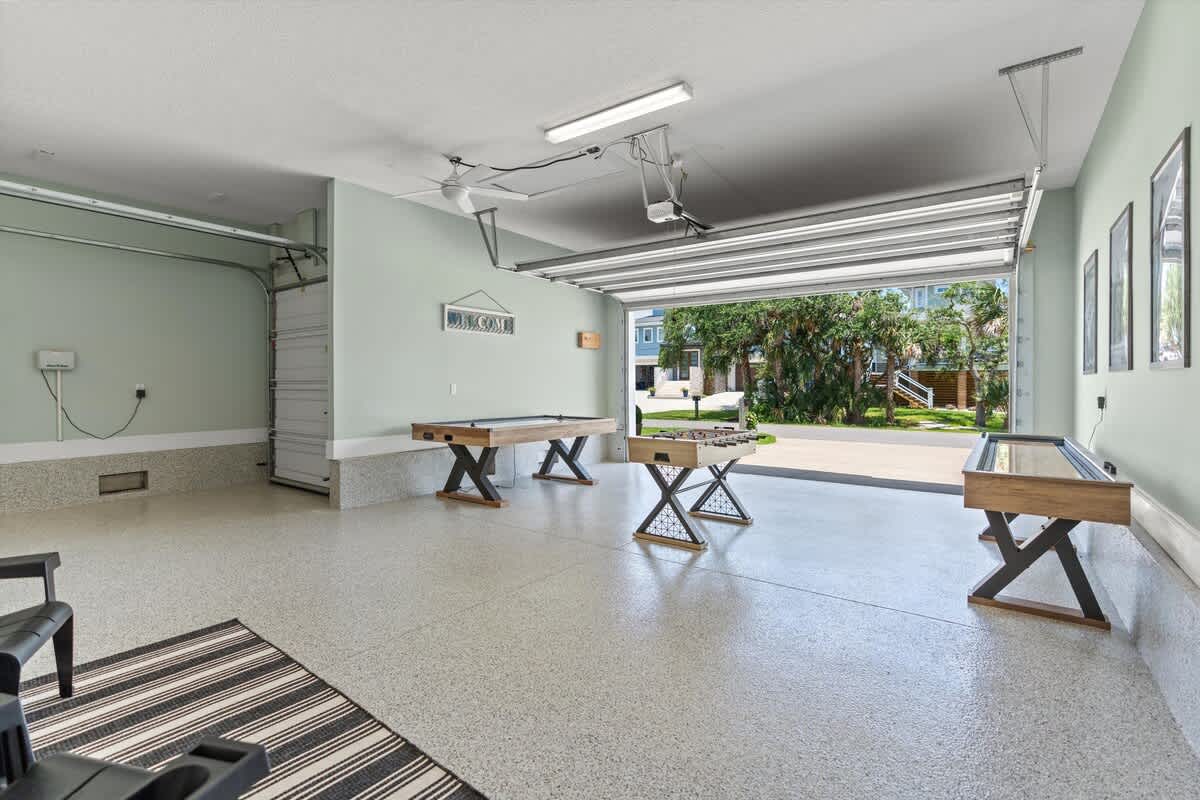 Garage converted to Game Room with foosball, shuffleboard, and air hockey and storage for beach equipment You can park a golf cart here if you'd like to rent one.