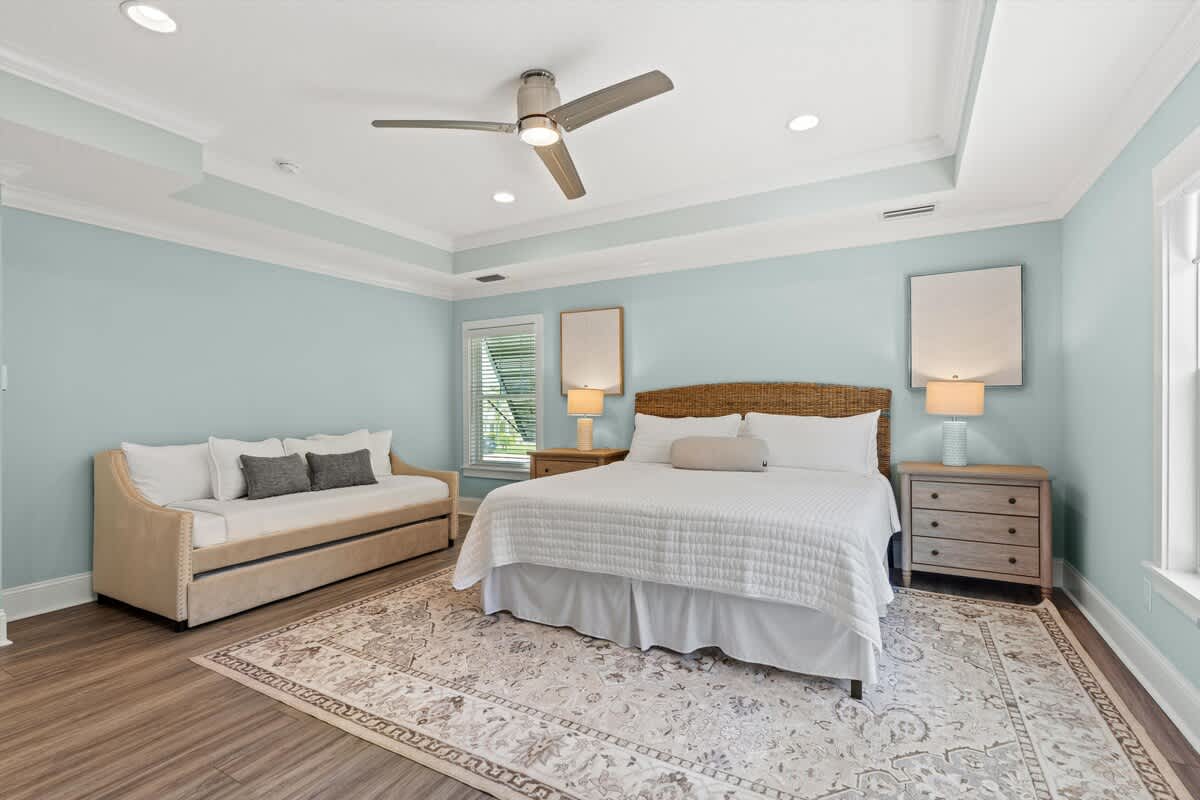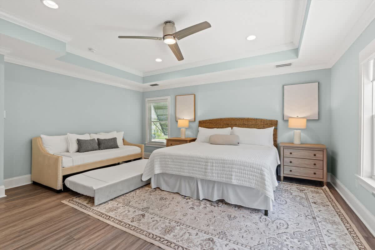 Primary Bedroom with King, two twin beds (trundle) and a walk-in closet and large bathroom with shower.