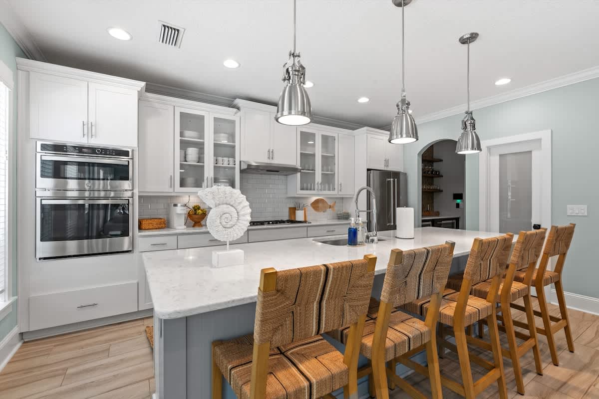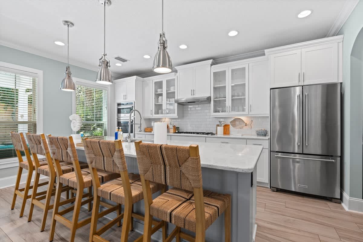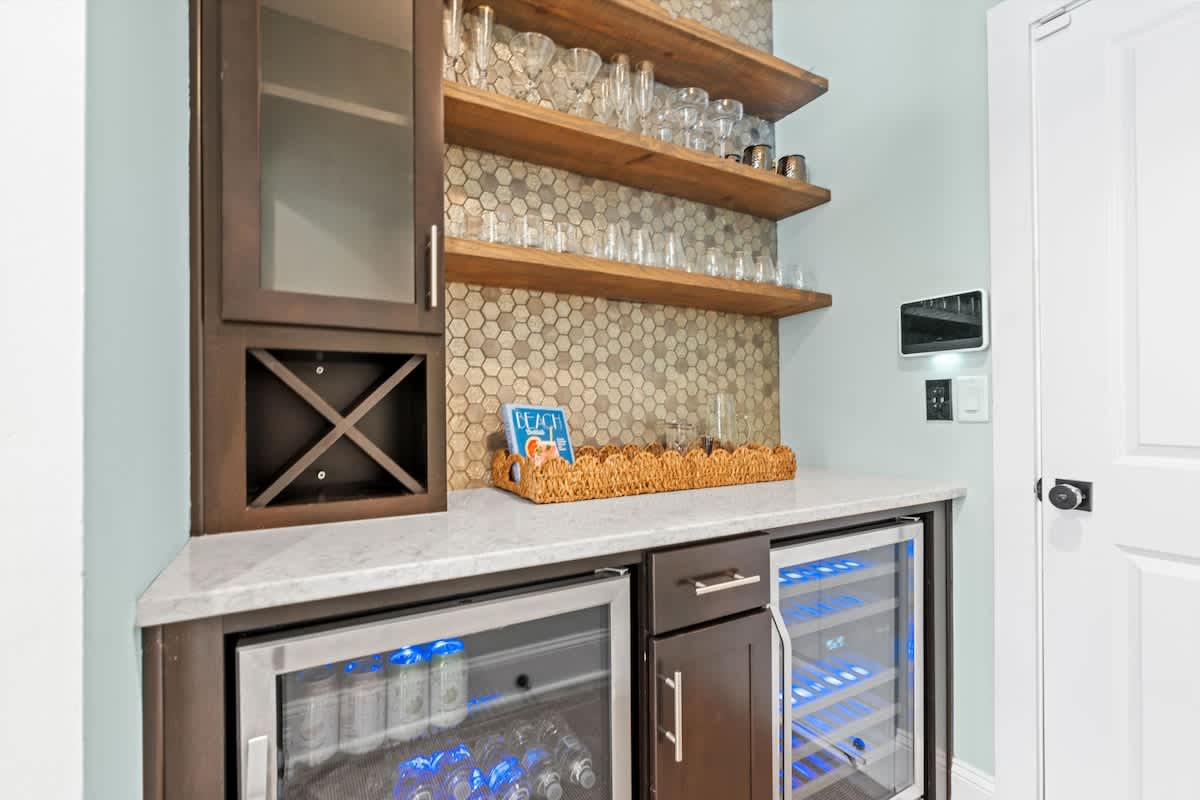 The fully stocked gourmet kitchen includes a gas cooktop, Keurig, blender, hot water kettle, wine fridge, and all the essentials to make you feel at home. For your beach days, we provide towels, 6 chairs, spikeball, an umbrella, beach cart, and a rolling cooler.
