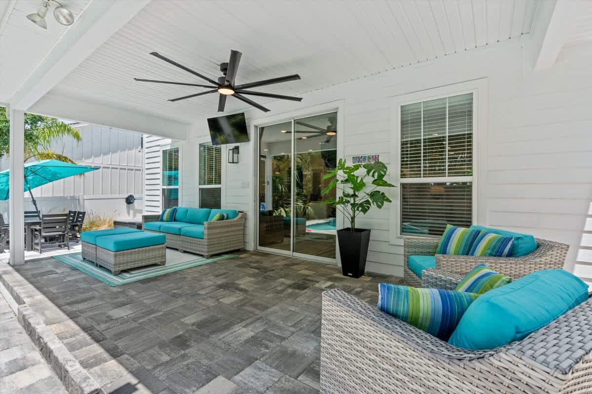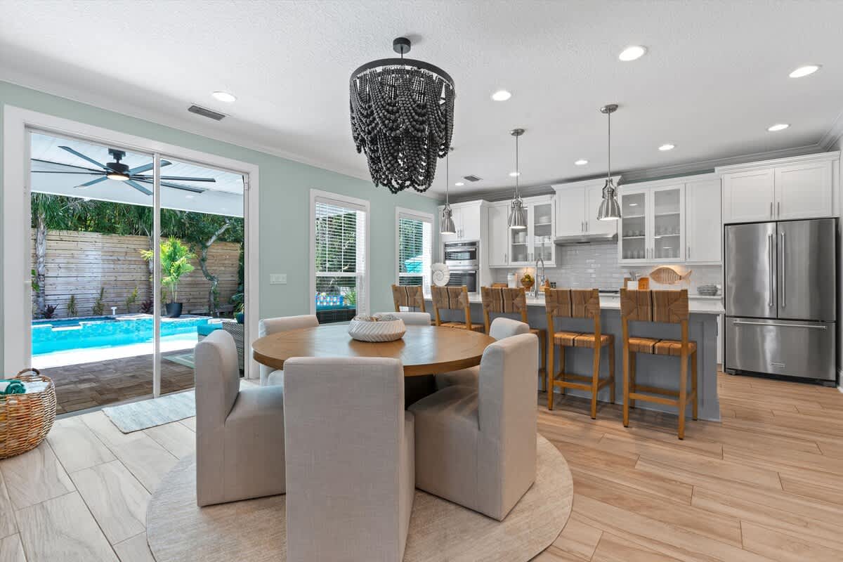 Sliding doors you can open to enjoy the breeze to the outdoor dining and large heated pool