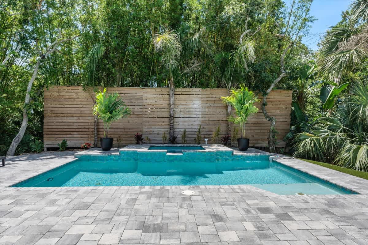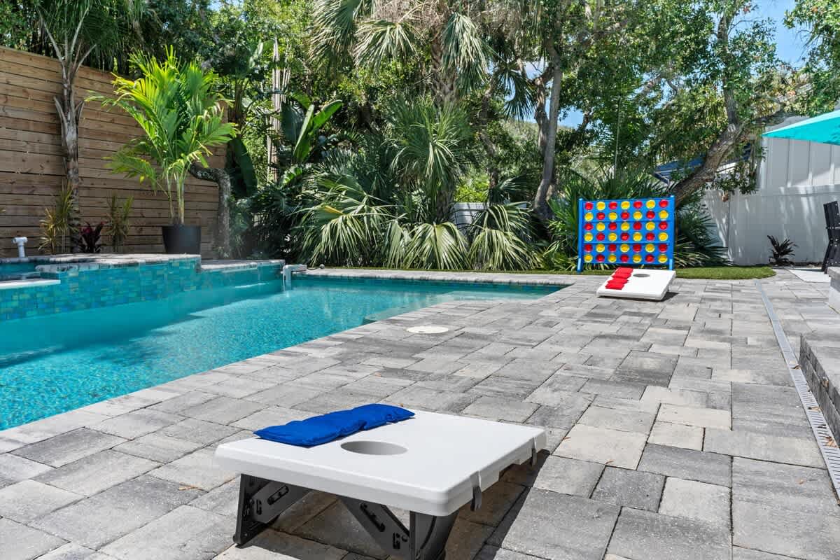 Step outside to your private oasis, featuring a large heated pool, lounge chairs, Smart TV, outdoor dining area with a charcoal grill, outdoor shower, and a fun game of cornhole, all while feeling secluded with the bamboo privacy. Inside the garage, guests can enjoy some friendly competition with air hockey, foosball, and shuffleboard.